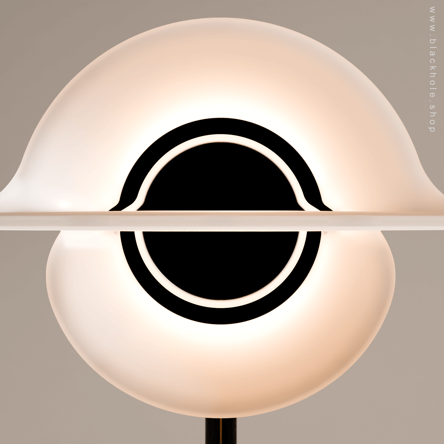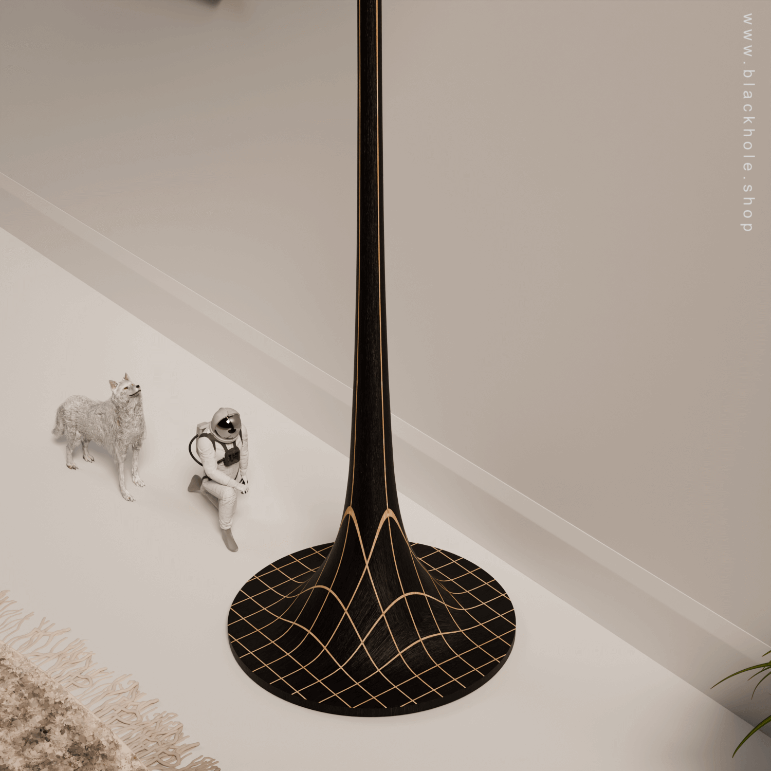 A sculptural floor lamp that merges cosmic inspiration with refined design. The hardwood base, patterned with a stretched spacetime grid, rises to support the luminous black hole, its sculpted curves mirroring the way gravity distorts the fabric of the spacetime.