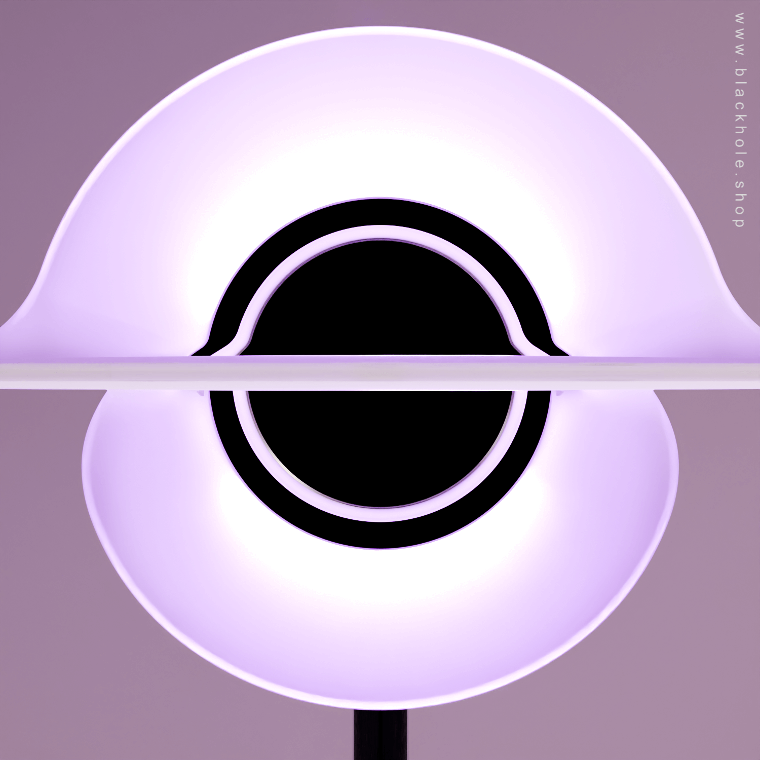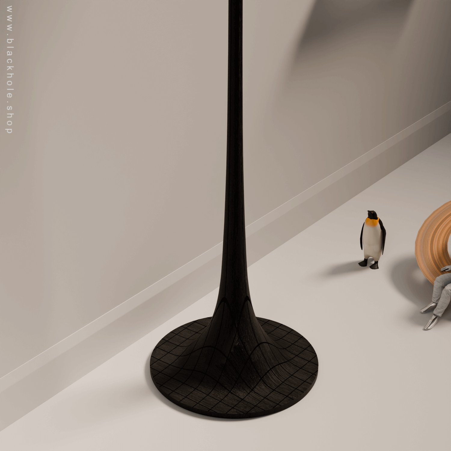 A sculptural floor lamp that fuses cosmic inspiration with dynamic design. Its hardwood base, patterned with a stretched spacetime grid, rises to support the luminous black hole, its sculpted curves mirroring the way gravity distorts the fabric of the spacetime.