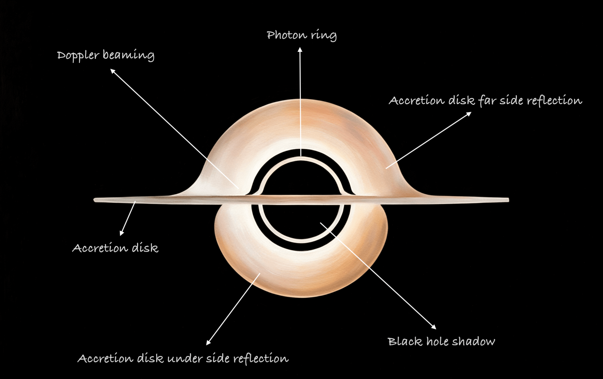Similarly, light from the underside of the accretion disk curves around the black hole and appears as a faint arc below the main disk — a visual artifact of warped spacetime.
