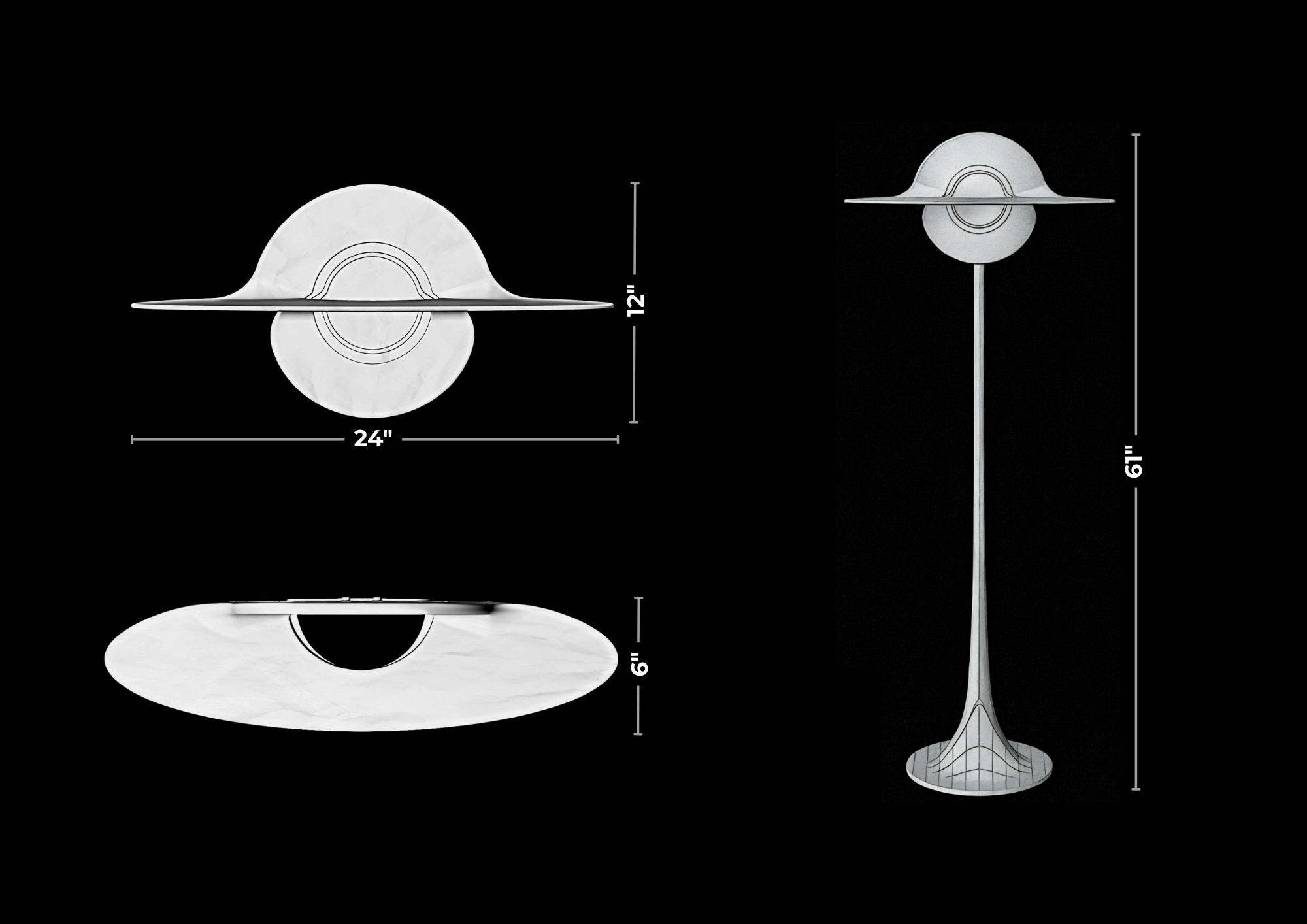 A sculptural floor lamp that merges cosmic inspiration with refined design. The hardwood base, patterned with a stretched spacetime grid, rises to support the luminous black hole — its sculpted curves echoing the way gravity bends the fabric of spacetime.
